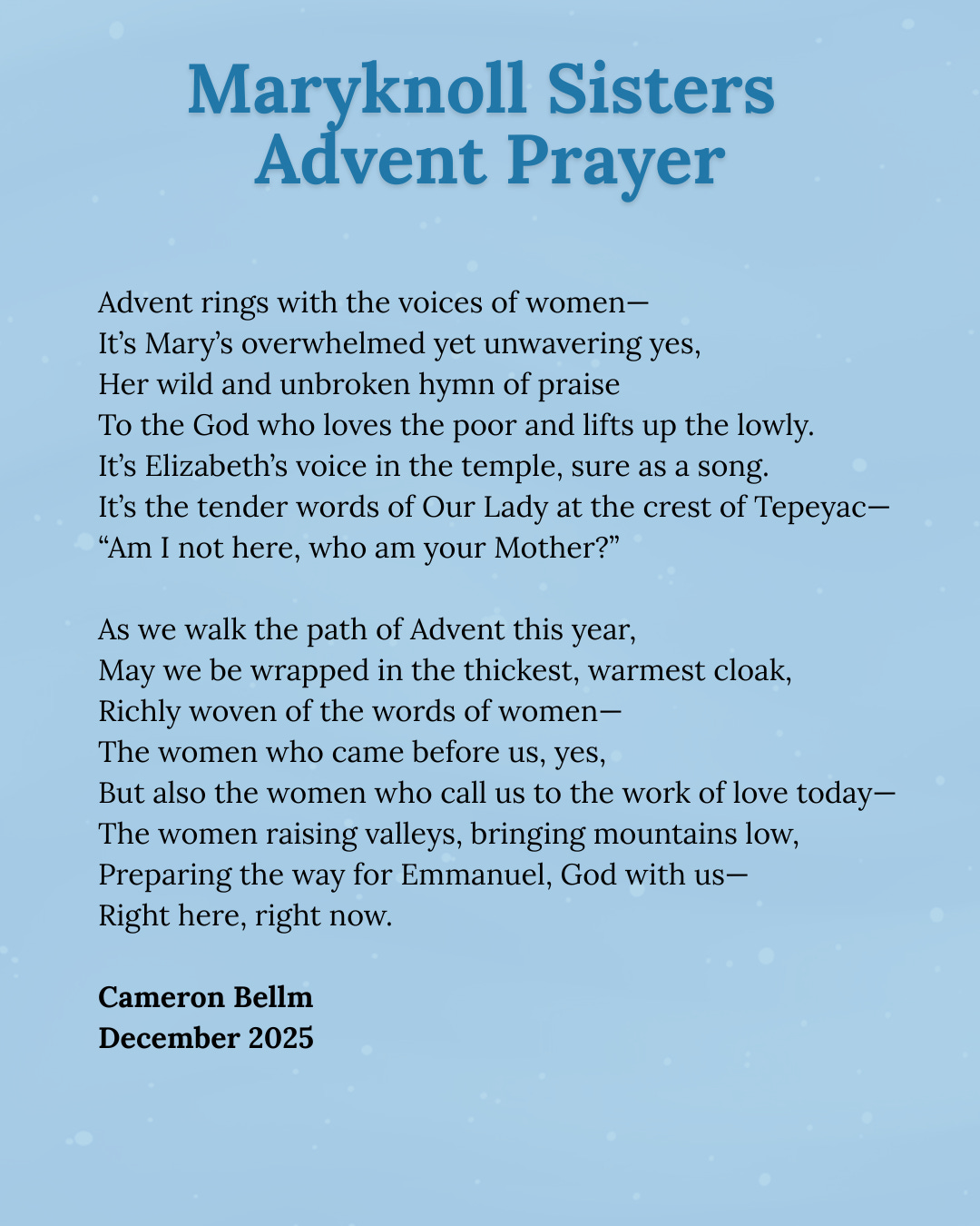 When the Maryknoll Sisters reached out to ask me to spread the word about their giving campaign, I offered to write them a prayer, a prayer about the voices of the women in Advent, and about the voices of these sisters who are living Advent every day.